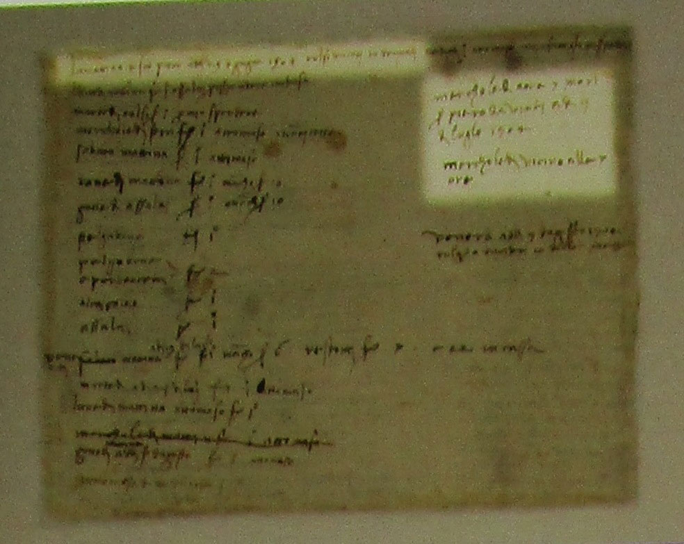 Il percorso inizia con le carte scritte nell’arco di tempo compreso tra l’adolescenza e i trent’anni. Il primo foglio contiene la famosa frase in cui Leonardo critica la prospettiva di Botticelli “Sandro, tu non di’ perché tali cose seconde paiono più basse che le terze” e che rimanda al periodo in cui ambedue frequentavano la bottega del Verrocchio.